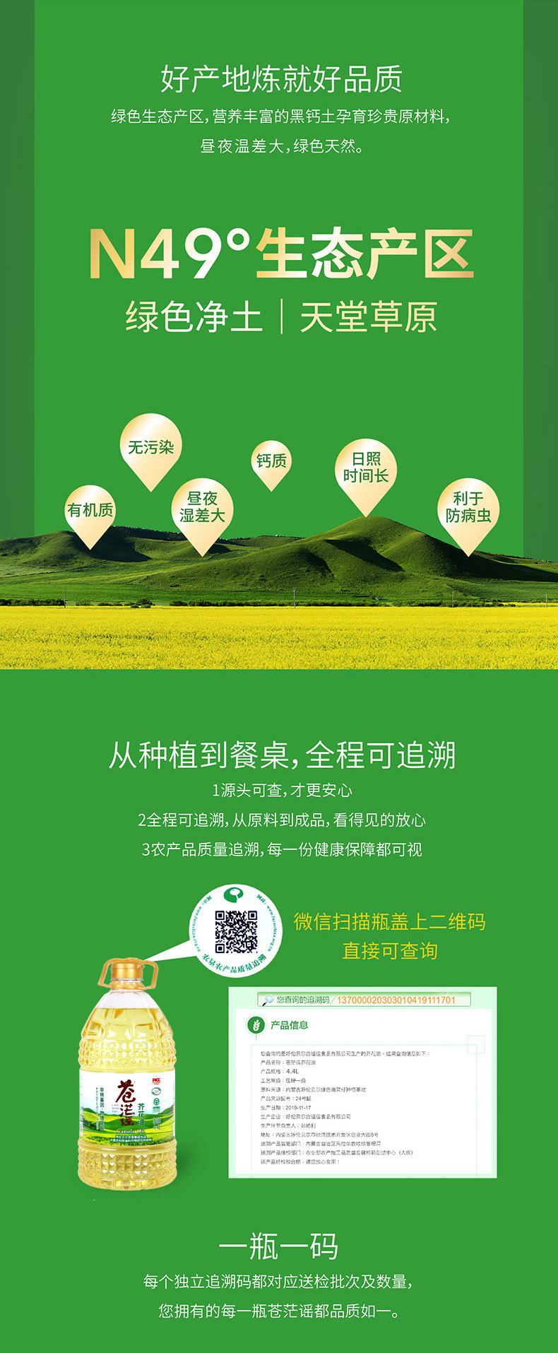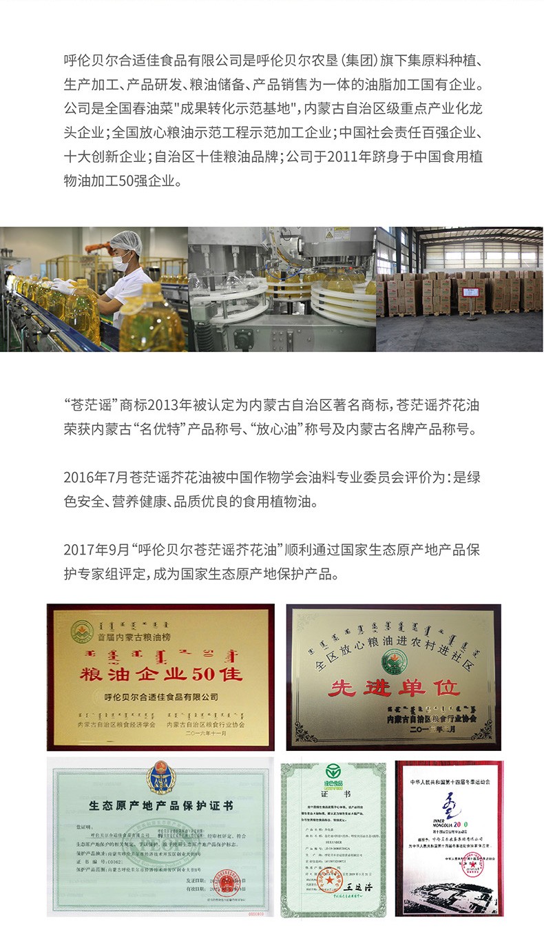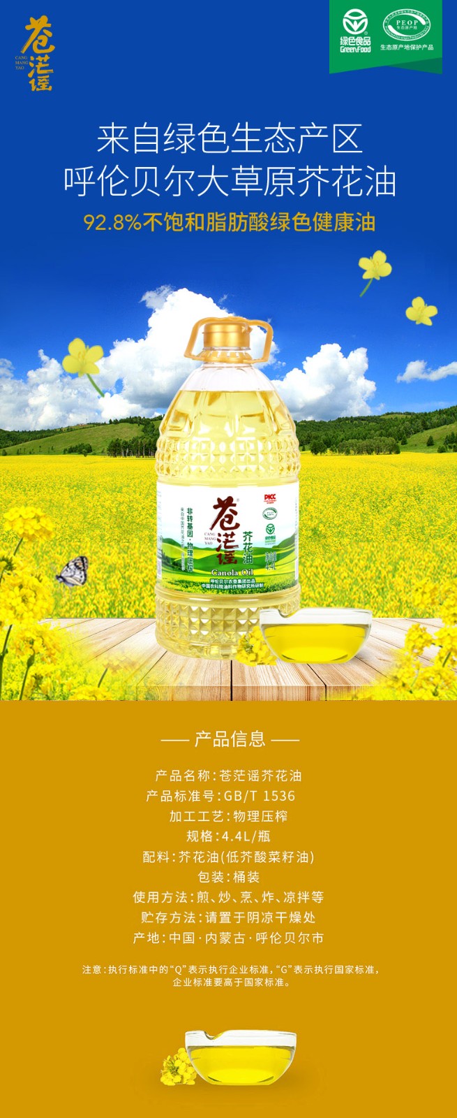 呼倫貝爾農墾出品蒼茫謠芥花油非轉基因低芥酸菜籽油4.4L裝