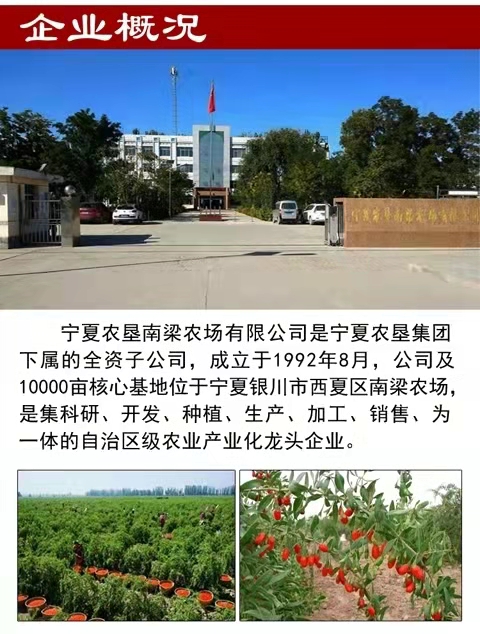寧夏農(nóng)墾南梁農(nóng)場(chǎng)有限公司【原寧夏枸杞企業(yè)(集團(tuán))公司】成立于1992年8月,位于銀川市西夏區(qū)南梁農(nóng)場(chǎng),是寧夏農(nóng)墾集團(tuán)有限公司所屬的枸杞種植、加工、銷售為一體的專業(yè)化公司。已有50多年的枸杞栽培歷史,所產(chǎn)枸杞素以粒大、肉厚、籽少、味甜、藥效高而居寧夏枸杞之冠。